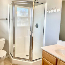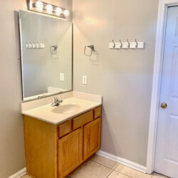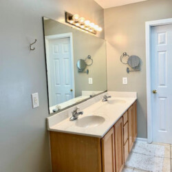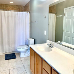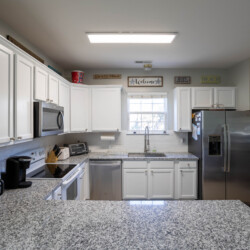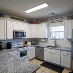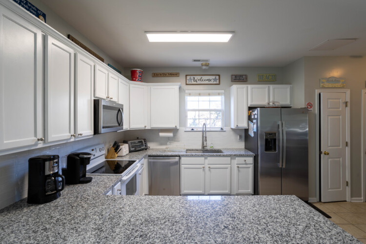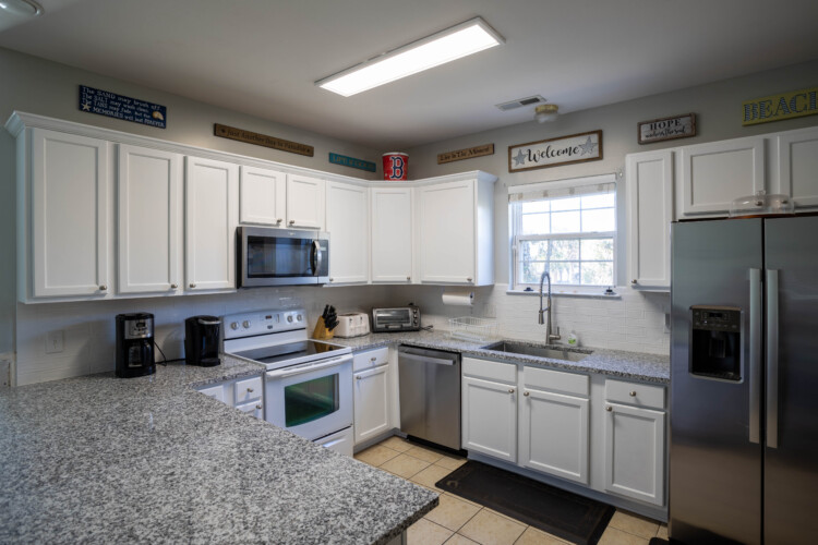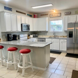 The house is the 2 streets from the beach, and it is about a 2 minute walk. We got the beach package, which included a golf cart plus beach chairs, umbrellas, pool toys, and more, i would recommend this as you can use the cart to drive to the beach (there is golf cart parking right by the beach walkway), and this cart allows you to load up a cooler, and all your stuff, you can easily make a few trips if you need. Also the area allows you to drive a golf cart, so you can use it to visit restaurants nearby and not deal with the car/parking. The house itself is just as the info on the page states. Each bedroom has its own attached bathroom and shower, and some have a shower/tub combo. There is an additional half bath on the main level as well. Kitchen wraps around to dining room and living room, so all guests can hang out together in one spot. The pool is good, not very big, but enough for 10-12 people to hang out and cool off… this house is good for a trip with all adults, sharing rooms or beds, or a trip with a few families with children, where each family has their own bedroom/bathroom space. Driveway can fit 3 cars easily, and a 4th if you move up all the way. Location is great, house is solid, and we very much enjoyed our stay.